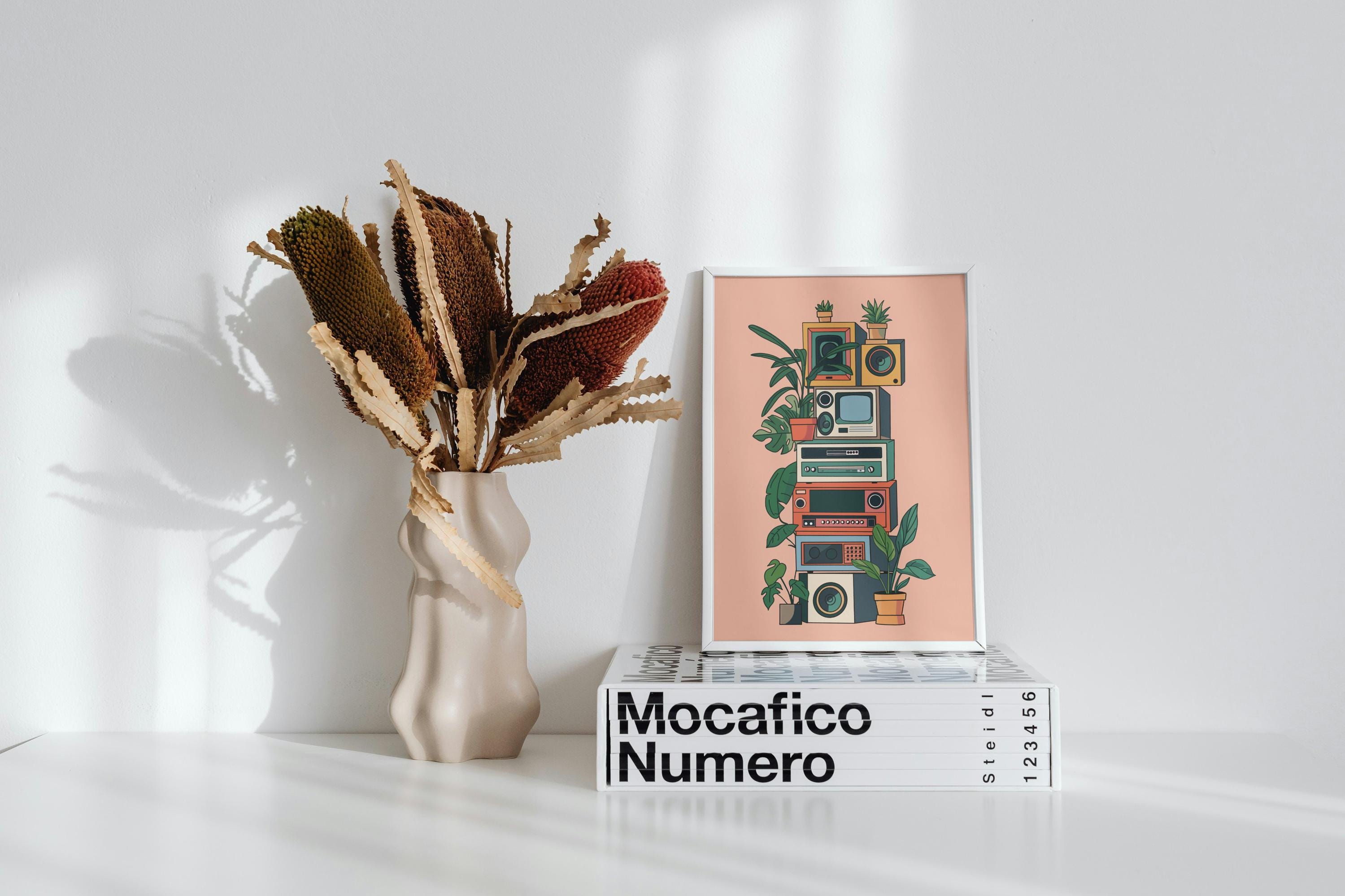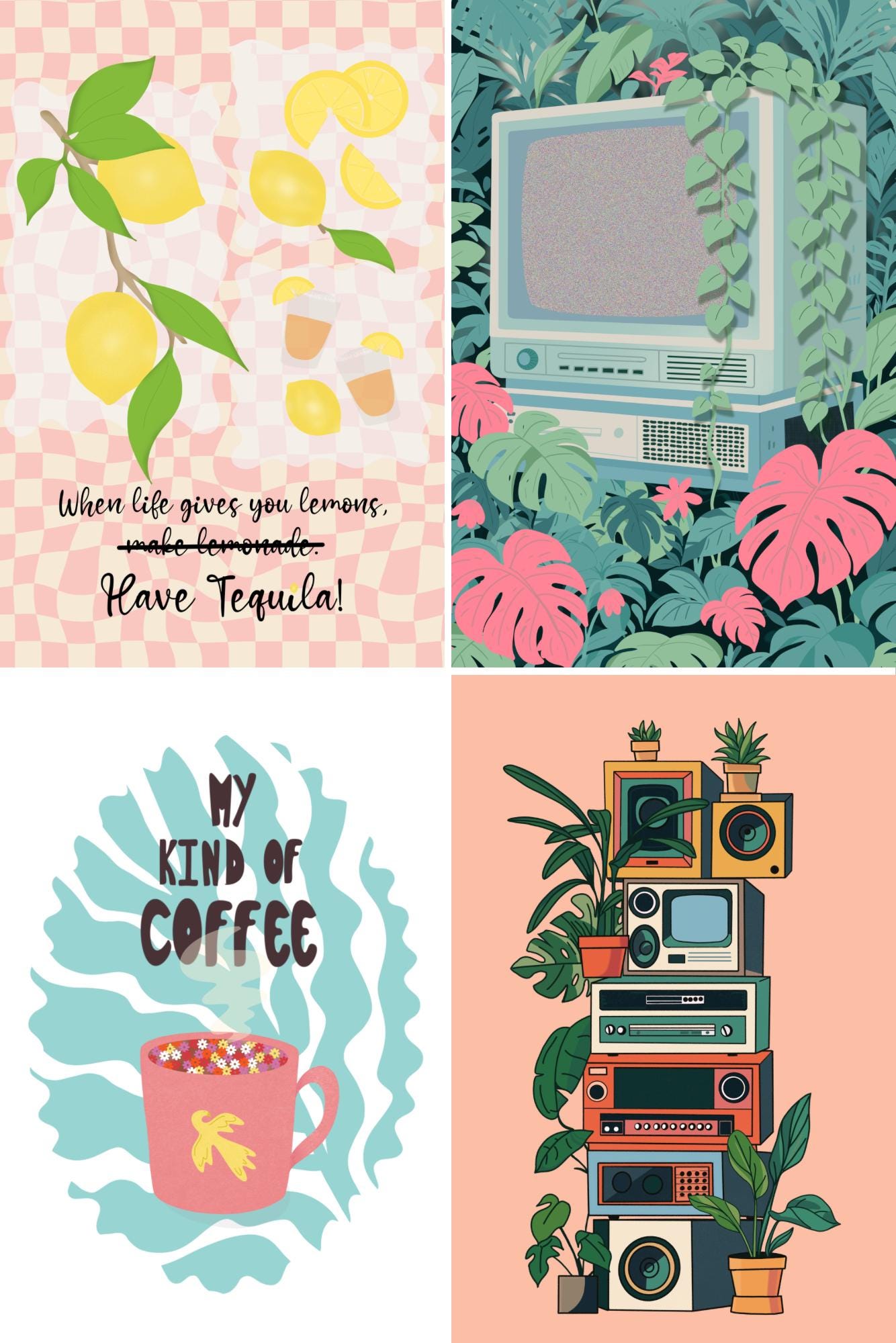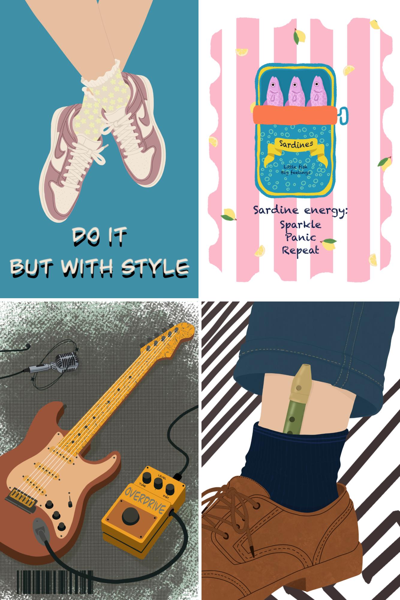Bold, slightly absurd, and full of personality. A series of graphic illustrations mixing humor, nostalgia, and everyday objects. Perfect for creative spaces, dorm rooms, music lovers, and people who appreciate playful design.